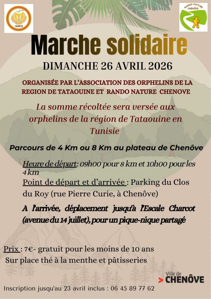 Le dimanche 26 avril 2026, une marche solidaire aura lieu au plateau de Chenôve, au profit des orphelins de la région de Tataouine en Tunisie 🇹🇳